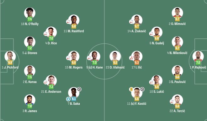 英格兰(4231):1-皮克福德;3-里斯-詹姆斯,2-孔萨,5-斯通斯,18-奥赖利;4-赖斯(65‘8-亨德森),21-安德森;7-萨卡,15-罗杰斯(65‘10-贝林厄姆),11-拉什福德(64‘19-埃泽);9-凯恩(65‘17-福登)